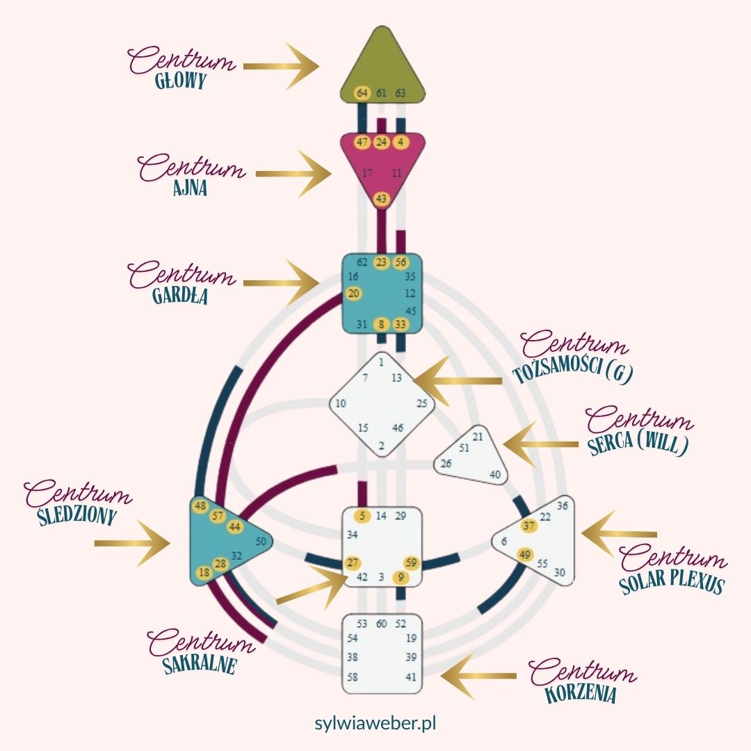 Z perspektywy centrów energetycznych w Human Design ta blokada dotyczy często otwartego centrum tożsamości (G), centrum serca lub centrum gardła — gdy czujemy, że musimy udowodnić światu, że jesteśmy „kimś”. Zwłaszcza, jeśli Twoje centrum G jest otwarte lub niezdefiniowane, to potrzebujesz przebywać w miejscach i z ludźmi, przy których czujesz się sobą. Jeśli po spotkaniu czujesz się „niewidzialna” lub napięta — to sygnał, że to prawdopodobnie nie Twoje środowisko i trudno Ci w nim działać. Centrum gardła z kolei odpowiedzialne jest nie tylko za komunikację, ale również za manifestację, czyli za to, żeby nasze działania napotykały na jak najmniejszy opór w świecie.